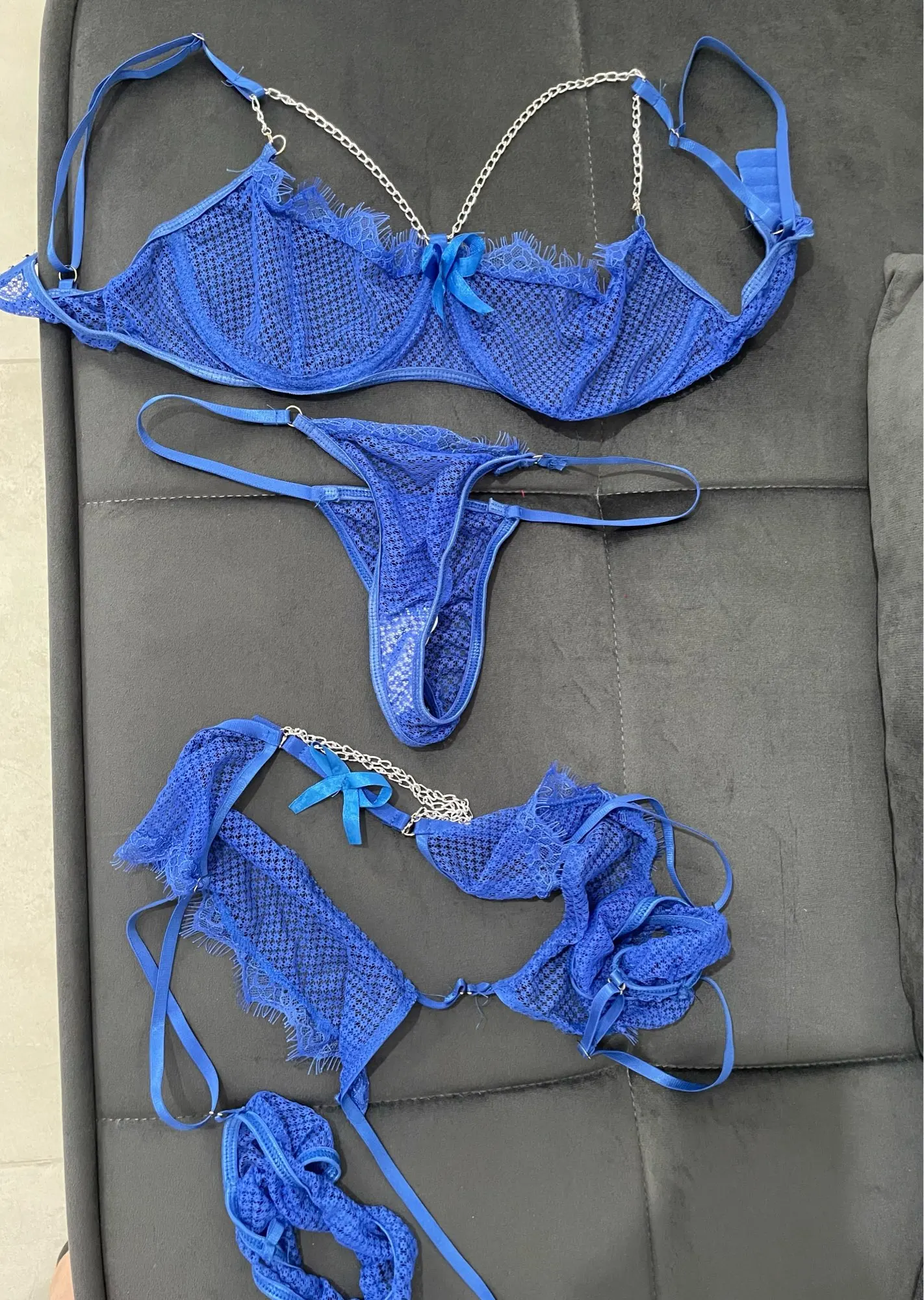 Cet ensemble de lingerie se compose de trois pièces irrésistibles : un soutien-gorge à armatures élégant, une culotte séduisante et un porte-jarretelles envoûtant, le tout agrémenté de jeux de chaînes raffinés qui apportent une touche audacieuse à votre allure.